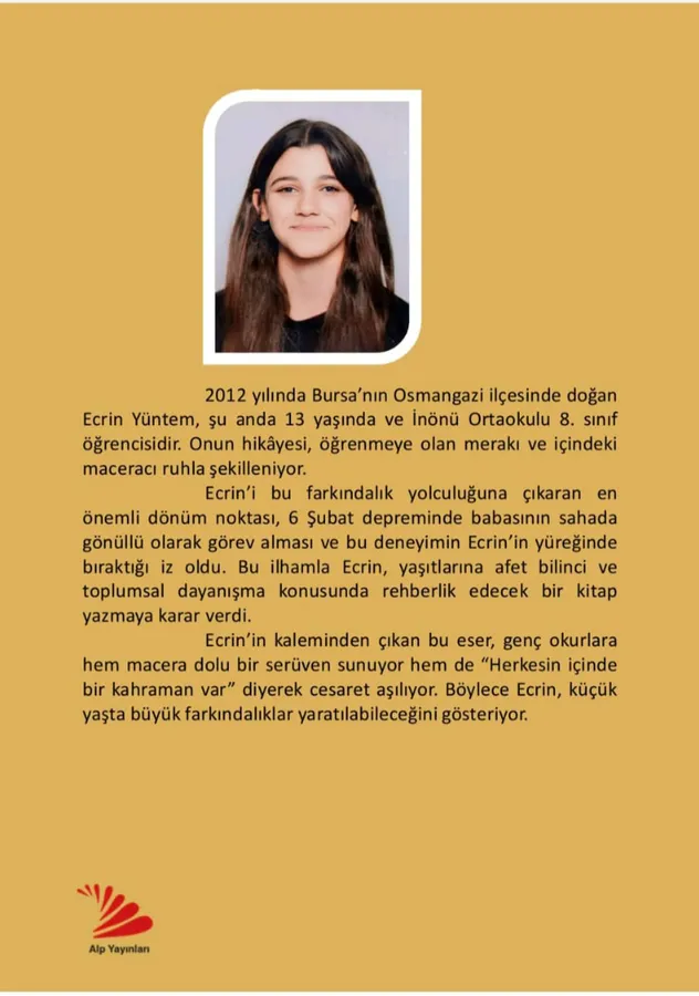 Bursa'da ortaokul üçüncü sınıf öğrencisi olan 13 yaşındaki Ecrin Yüntem; doğa sevgisini ve afetlere hazırlıkla ilgili kişisel duyarlılığını birleştirerek, yaşıtlarına afet bilinciyle ilgili rehberlik edecek bir kitap yayımladı.