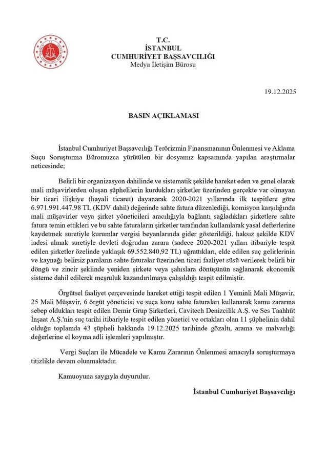 Toplam 26 şirkete ve mali müşavire operasyon! Çok sayıda gözaltı var.Konuyla ilgili olarak İstanbul Cumhuriyet Başsavcılığınca yapılan açıklama şöyle: