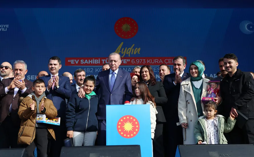 Cumhurbaşkanı Recep Tayyip Erdoğan, Aydın Büyükşehir Belediye Binası önünde düzenlenen; “Ev Sahibi Türkiye” 6.973 Kura Çekimi, 1.482 Konut Anahtar Teslimi, Şehir Hastanesi ve Yapımı Tamamlanan Diğer Yatırımların Toplu Açılış Töreni’ne katılarak bir konuşma yaptı.