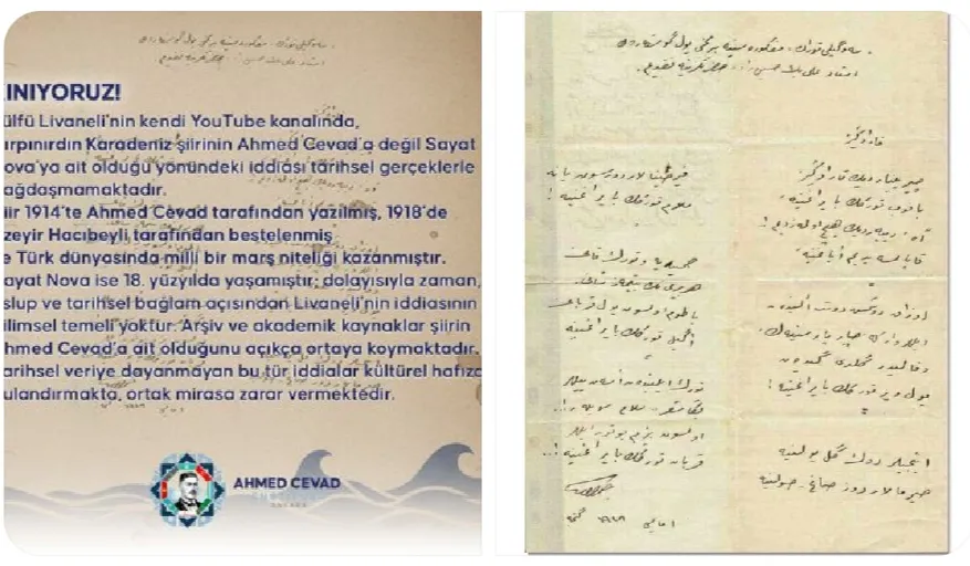 Zülfü Livaneli’nin kendi YouTube kanalında yayımladığı podcast’te, şair Ahmed Cevad’ın “Çırpınırdın Karadeniz” şiirinin aslında Ermeni asıllı âşık Sayat Nova’ya ait olduğu yönünde ortaya attığı iddia, hem tarihsel gerçeklikten tamamen kopuktur hem de edebiyat ve kültür tarihi konusunda sorumluluk sahibi herkesin kaçınması gereken bir bilgi kirliliğidir.