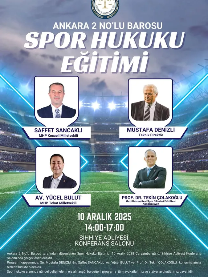 "Ankara 2 No’lu Barosu tarafından düzenlenen Spor Hukuku Eğitimi, 10 Aralık 2025 Çarşamba günü, Sıhhiye Adliyesi Konferans Salonu’nda gerçekleştirilecektir.