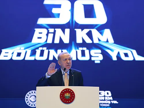 Eğitimden sağlığa, teknolojiden savunma sanayine her alanda başarıdan başarıya koştuklarını, başkalarıyla değil, her zaman kendileriyle yarıştıklarını aktaran Cumhurbaşkanı Erdoğan, şöyle devam etti: "Hep daha iyisini, daha güzelini, ilerisini hedefledik. Eski Türkiye'yi bilen herkes bugün şu gerçeği kabul ediyor: İktidarlarımızın başarı hikâyesi yazdığı, Türkiye'ye çağ atlattığı, Türkiye'nin makûs talihini değiştirdiği alanların en başında ulaştırma vardır. Kara, hava, deniz yolları ulaşımında bir yandan proje ve yatırımlarımızla altyapıyı güçlendirirken diğer yandan yolcu sayısını en yüksek seviyelere getirdik. Biliyorsunuz 10 gün önce Ankara'da Esenboğa Havalimanı'mızın üçüncü pistiyle yeni kule ve tamamlayıcı tesislerin açılışını gerçekleştirdik. İstanbul Havalimanı'mız, dünyanın en gözde havalimanlarından biri olarak kendi alanında küresel bir markaya dönüştü. Deniz ulaşımında daha önce hayal dahi edilemeyen projeleri hayata geçirdik. Kara yolu ulaşımında ise adeta destan yazdık. Bakın şuraya özellikle dikkatinizi çekmek istiyorum. Göreve geldiğimizde bölünmüş yol uzunluğumuz ne kadardı? Sadece 6 bin 101 kilometreydi. Yalnızca altı vilayetimiz bölünmüş yollarla birbirine bağlıydı. Tek gidişli gelişli yollarda milletimizin ömründen ömür gidiyordu. Türkiye'ye yakışmayan, milletimize yakışmayan bu tabloyu değiştirdik. Hiç vakit kaybetmeden çalışmaları başlattık ve 23 yılda bölünmüş yollarla birbirine bağlanan il sayımızı 77'ye, bölünmüş yol uzunluğumuzu ise tam 30 bin 49 kilometreye çıkardık. İşte bugün de bölünmüş yollarımızın 30 bininci kilometresinin kurdelesini sizlerle birlikte kesmenin heyecanı içindeyiz."
