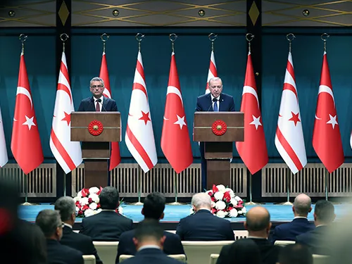 Cumhurbaşkanı Recep Tayyip Erdoğan ve Kuzey Kıbrıs Türk Cumhuriyeti (KKTC) Cumhurbaşkanı Tufan Erhürman, Cumhurbaşkanlığı Külliyesinde gerçekleştirdikleri görüşmelerin ardından ortak basın toplantısı düzenledi.