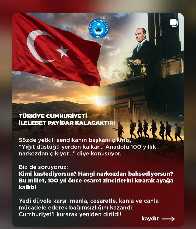 Memur-Sen'e bağlı sendikacının sözlerine cevap veren Önder Kahveci "Bu millet, 100 yıl önce esaret zincirlerini kırarak ayağa kalktı! Yedi düvele karşı imanla, cesaretle, kanla ve canla mücadele ederek bağımsızlığını kazandı!