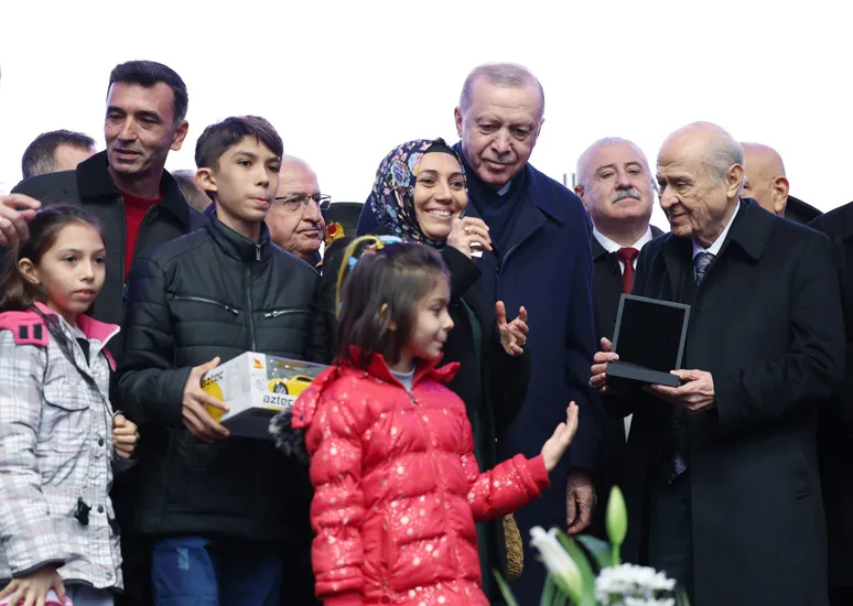 Hükûmet olarak vatandaşların hayatını kurtarmaya, onlara yepyeni bir gelecek sunmaya çalışırken, ana muhalefetin başını çektiği bazı çevrelerin depremden siyasi rant devşirmenin hesabını yaptığını dile getiren Cumhurbaşkanı Erdoğan, şunları kaydetti: "Millet ve memleket hayrına ne kadar proje, eser, hizmet ve yatırım varsa hepsine çamur atmayı vazife sayan bu hazımsızlar, bu depremzedelerimizin acılarını menfaate çevirmeye, duygularını istismar etmeye çalıştılar. Deprem turistlerinin atmadıkları iftira, söylemedikleri yalan, yapmadıkları dezenformasyon kalmadı. Çıktılar hep bir ağızdan koro hâlinde 'Devlet vatandaşını yalnız bıraktı.' dediler. 'Arama kurtarma faaliyetleri, yardım çalışmaları oy rengine göre yapılıyor' dediler. 'Bunlar bu evleri bitiremez.' dediler. İşte evler burada. Evler burada. Kardeşlerim, bunların 'bitmez' dediği evler burada. Ne bir işin ucundan tuttular ne de ellerini taşın altına koydular. Maalesef böyle bir mesele bile ne yazık ki bunların gündemine gelmedi. Burada da partizanca davrandılar. Peki, sonuçta ne oldu? Hepsinin hevesi kursaklarında kaldı. İktidarımızın ve ittifakımızın enkaz altında kalmasını bekleyenler büyük bir hayal kırıklığına uğradı. Bunların bizleri yıldırmayı, bizim irademizi kırmayı amaçlayan toksik siyasetine teslim olmadık. 'Allah'ın izniyle biz bu işin altından kalkarız.' dedik ve hemen işe koyulduk. Sadece 3 yıl gibi kısa sürede şehirlerimizi yeniden imar ve ihya ettik. İttifak ve iktidar olarak sizlere verdiğimiz sözleri yerine getirdik."