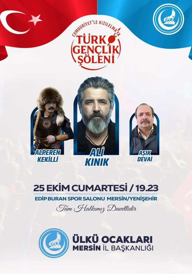 Ülkü Ocakları Mersin İl Başkanlığı tarafından “Cumhuriyet ile Kızılelma’ya” Türk Gençlik Şöleni yarın (25 Ekim 2024 Cumartesi) düzenleniyor.
