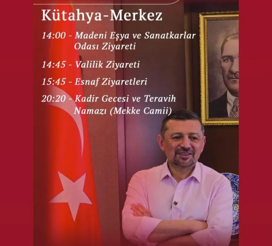 MHP Kütahya Milletvekili ve TBMM İçişleri Komisyonu Başkanvekili Ahmet Erbaş bugün de Kütahya'da çeşitli ziyaretlerde bulunacak ve akşam da Mekke Camiindeki Kadir Gecesi programina katılacak.