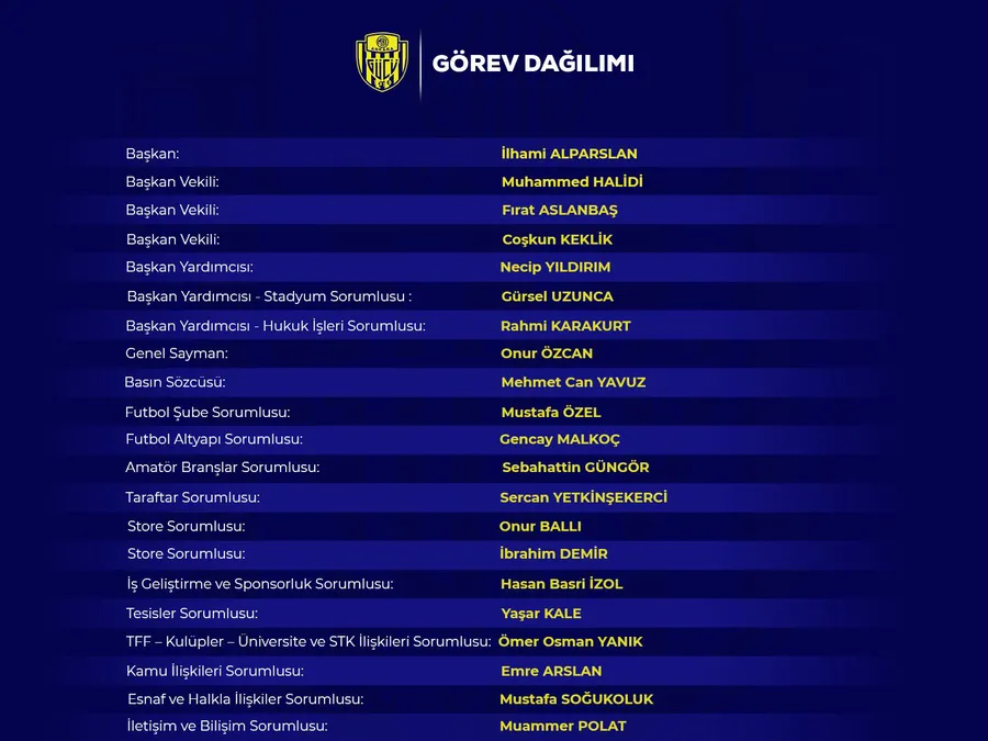 Kulüp Başkanı İlhami Alpaslan Başkanlığında, Beştepe Tesislerinde gerçekleşen yönetim toplantısında alınan karar gereği Yönetim Kurulu arasında görev dağılımı belirlendi.