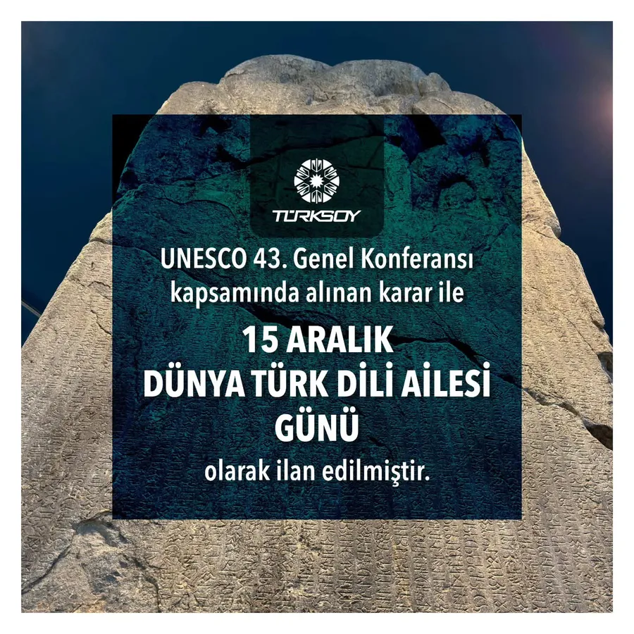 "UNESCO’nun 43. Genel Konferansı kapsamında alınan kararla 15 Aralık günü “Dünya Türk Dili Ailesi Günü” olarak ilan edilmiştir. Bu karar, Türk Dünyası’nın ortak değeri olan Türk dilinin uluslararası düzeyde tanınırlığını artıracak, Türkçe konuşan topluluklar arasındaki kültürel ve manevi bağları daha da güçlendirecektir.