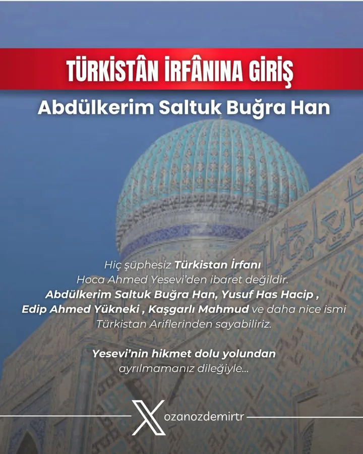 Hiç şüphesiz Türkistan İrfanı Hoca Ahmed Yesevi’den ibaret değildir. Saltuk Buğra Han, Yusuf Has Hacip , Edip Ahmed Yükneki, Kaşgarlı Mahmud ve daha nice ismi Türkistan Ariflerinden sayabiliriz.